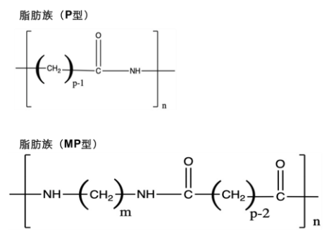 PA12、PA612和PA1012同屬于脂肪族尼龍,PA12屬于脂肪族尼龍中的P型,PA612和PA1012屬于脂肪族尼龍中的MP型。P型脂肪族尼龍通過(guò)氨基酸或內(nèi)酰胺開(kāi)環(huán)聚合,p代表單體碳鏈上的碳原子